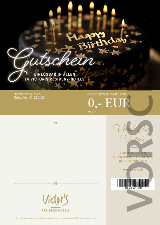 Sie sind auf der Suche nach einem individuellen Geschenk? Lassen Sie den Beschenkten doch einfach selbst entscheiden – mit einem der Wertgutscheine aus Victor's Welt! Die sind nämlich in allen 14 Victor's Residenz-Hotels gültig.