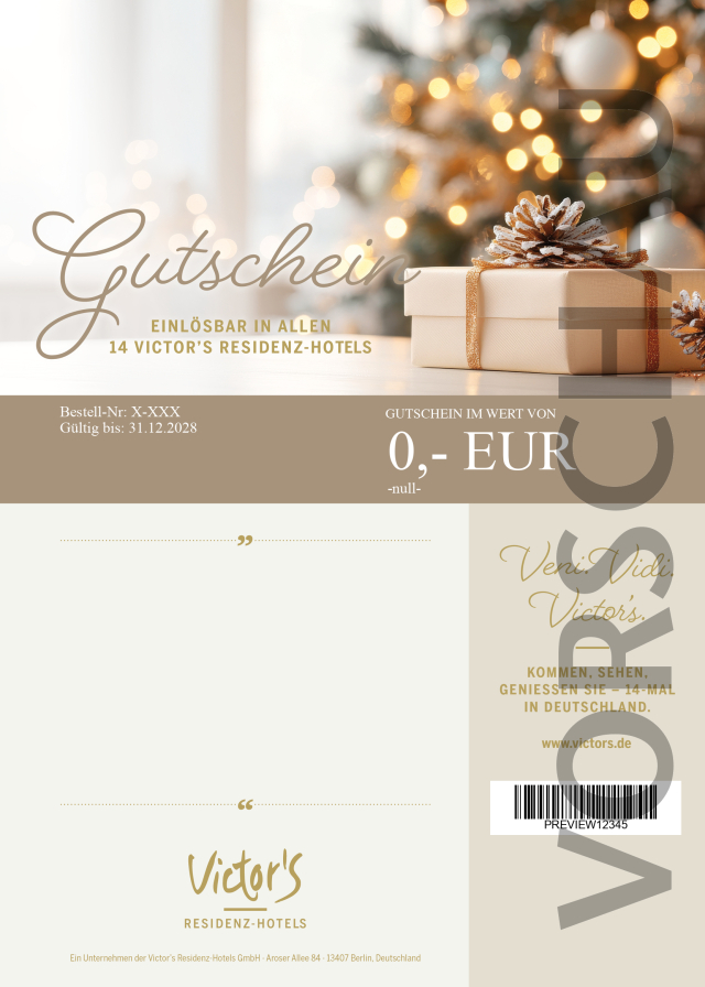 Sie sind auf der Suche nach einem individuellen Geschenk? Lassen Sie den Beschenkten doch einfach selbst entscheiden – mit einem der Wertgutscheine aus Victor's Welt! Die sind nämlich in allen 14 Victor's Residenz-Hotels gültig.