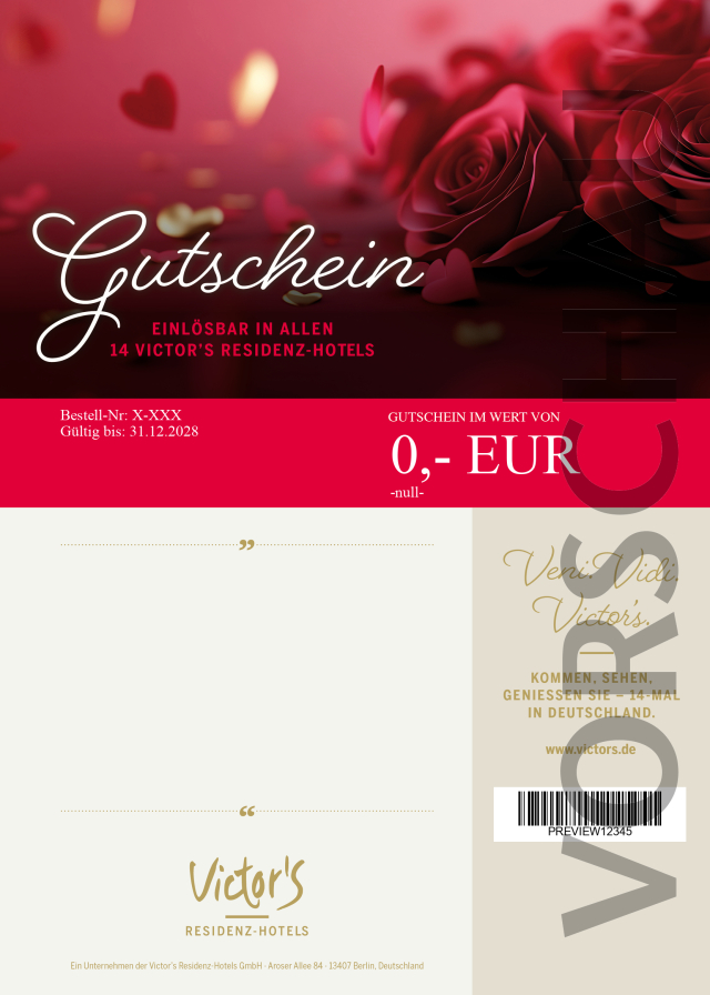 Sie sind auf der Suche nach einem individuellen Geschenk? Lassen Sie den Beschenkten doch einfach selbst entscheiden – mit einem der Wertgutscheine aus Victor's Welt! Die sind nämlich in allen 14 Victor's Residenz-Hotels gültig.